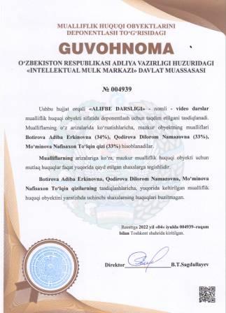 | 5160 | №004939 | Video darslar -"ALIFBE DARSLIGI" | Botirova Adiba Erkinovna (34%), Qodirova Dilorom Namazovna (33%), Mo‘minova Nafisaxon To‘lqin qizi (33%) | Botirova Adiba Erkinovna, Qodirova Dilorom Namazovna, Mo‘minova Nafisaxon To‘lqin qizi | 07/04/2022 | ![]() |