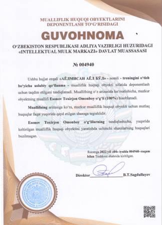 | 5159 | №004940 | Treningini o‘tish bo‘yicha uslubiy qo‘llanma - "АЁЛМИСАН АЁЛ БЎЛ" | Esonov Toxirjon Omonboy o‘g‘li (100%) | Esonov Toxirjon Omonboy o‘g‘li | 07/04/2022 | ![]() |