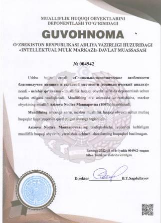 | 5157 | №004942 | Uslubiy qo‘llanma - "Социально-экономические особенности благополучия женщин в сельской местности (социологический анализ)" | Azizova Nodira Mannapovna (100%) | Azizova Nodira Mannapovna | 07/04/2022 | ![]() |
