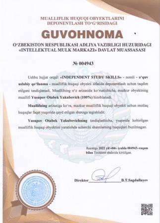 | 5156 | №004943 | O‘quv - uslubiy qo‘llanma -"INDEPENDENT STUDY SKILLS" | Yusupov Otabek Yakubovich (100%) | Yusupov Otabek Yakubovich | 07/04/2022 | ![]() |