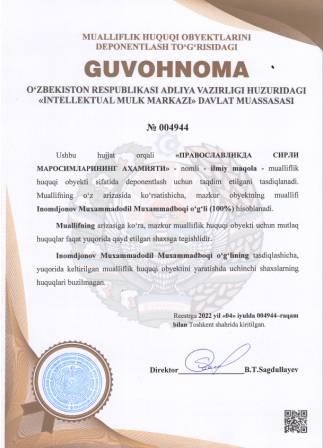 | 5155 | №004944 | Ilmiy maqola -"ПРАВОСЛАВЛИКДА СИРЛИ МАРОСИМЛАРИНИНГ АҲАМИЯТИ" | Inomdjonov Muxammadodil Muxammadboqi o‘g‘li (100%) | Inomdjonov Muxammadodil Muxammadboqi o‘g‘li | 07/04/2022 | ![]() |