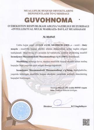 | 5154 | №004945 | Ilmiy maqola -"ОЛАМ АҲЛИ, БИЛИНГИЗ КИМ..." | Inomdjonov Muxammadodil Muxammadboqi o‘g‘li (100%) | Inomdjonov Muxammadodil Muxammadboqi o‘g‘li | 07/04/2022 | ![]() |