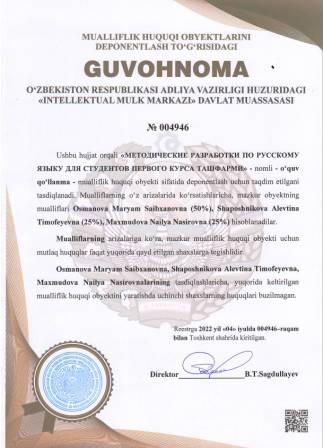 | 5153 | №004946 | O‘quv qo‘llanma -"МЕТОДИЧЕСКИЕ РАЗРАБОТКИ ПО РУССКОМУ ЯЗЫКУ ДЛЯ СТУДЕНТОВ ПЕРВОГО КУРСА ТАШФАРМИ" | Osmanova Maryam Saibxanovna (50%), Shaposhnikova Alevtina Timofeyevna (25%), Maxmudova Nailya Nasirovna (25%) | Osmanova Maryam Saibxanovna, Shaposhnikova Alevtina Timofeyevna, Maxmudova Nailya Nasirovna | 07/04/2022 | ![]() |