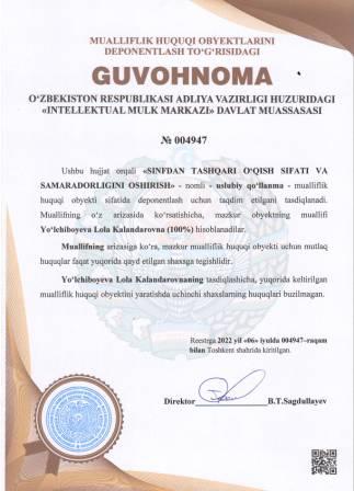 | 5152 | №004947 | Uslubiy qo‘llanma - "SINFDAN TASHQARI O‘QISH SIFATI VA SAMARADORLIGINI OSHIRISH" | Yo‘lchiboyeva Lola Kalandarovna (100%) | Yo‘lchiboyeva Lola Kalandarovna | 07/06/2022 | ![]() |