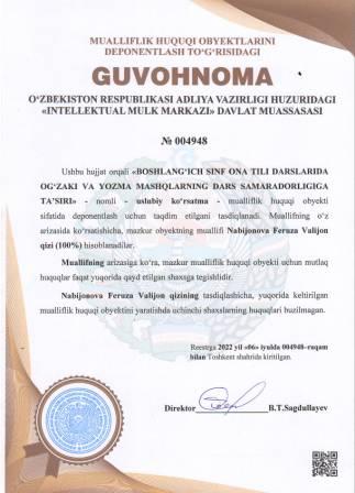 | 5158 | №004941 | Treningni o‘tish bo‘yicha uslubiy qo‘llanma - "ORZUGA ERISHISH" | Esonov Toxirjon Omonboy o‘g‘li (100%) | Esonov Toxirjon Omonboy o‘g‘li | 07/04/2022 | ![]() |