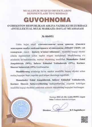| 5148 | №004951 | Dasturiy ta’minot ishlanmasi -Aвтоматлашган ҳолда қишлоқ ҳўжалиги экинларини мақбул жойлаштиришга мўлжалланган "SMART CROP" veb геопортали | Mamatkulov Zohid Jonqobilovich (50%), Safarov Eshkabul Yuldashovich (25%), Karimov Shuxrat Sattarovich (25%) | Mamatkulov Zohid Jonqobilovich, Safarov Eshkabul Yuldashovich, Karimov Shuxrat Sattarovich | 07/06/2022 | ![]() |