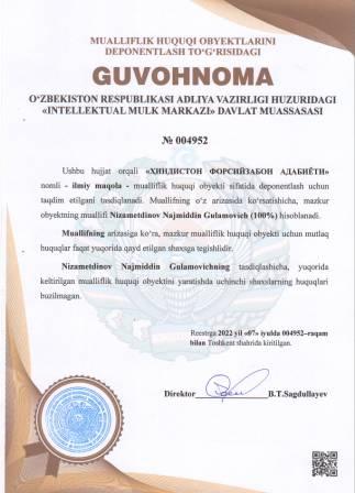 | 5147 | №004952 | Ilmiy maqola -"ҲИНДИСТОН ФОРСИЙЗАБОН АДАБИЁТИ" | Nizametdinov Najmiddin Gulamovich (100%) | Nizametdinov Najmiddin Gulamovich | 07/07/2022 | ![]() |