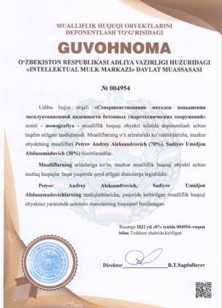 | 5145 | №004954 | Monografiya - "Совершенствование методов повышения эксплуатационной надежности бетонных гидротехнических сооружений" | Petrov Andrey Aleksandrovich (70%), Sadiyev Umidjon Abdusamadovich (30%) | Petrov Andrey Aleksandrovich, Sadiyev Umidjon Abdusamadovich | 07/07/2022 | ![]() |