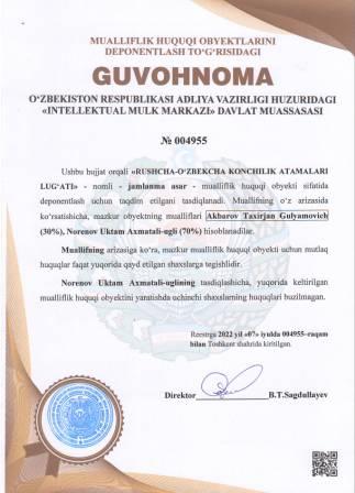 | 5144 | №004955 | Jamlanma asar - "RUSHCHA-O‘ZBEKCHA KONCHILIK ATAMALARI LUG‘ATI" | Akbarov Taxirjan Gulyamovich (30%), Norenov Uktam Axmatali-ugli (70%) | Akbarov Taxirjan Gulyamovich, Norenov Uktam Axmatali-ugli | 07/07/2022 | ![]() |