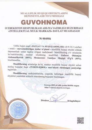 | 5143 | №004956 | Mavzulashtirilgan testlar to’plami - «DAVLAT VA HUQUQ ASOSLARI» (8-9-10-11-sinflar) | Gafarov Oktamjon Abdumalikovich (60%), Shomuratov Umidjon Minjigit O’g’li (40%), | «TURON-IQBOL» mas’uliyati cheklangan jamiyati | 07/08/2022 | ![]() |