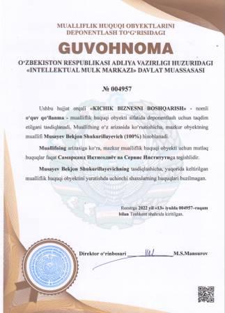 | 5142 | №004957 | O‘quv qo‘llanma -"KICHIK BIZNESNI BOSHQARISH" | Musayev Bekjon Shukurillayevich (100%) | Самарқанд Иқтисодиёт ва Сервис Институти | 07/13/2022 | ![]() |