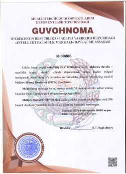 520 | №008803 | Elektron darslik – "MANTIQ PLATFORMASI" | Meliyev Sherali Orolovich (100%) | Meliyev Sherali Orolovich | 04/09/2025 | ![]() |