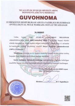 513 | №008810 | Ilmiy ishlanma (loyiha) – "ISHG‘OLCHI YO‘G‘ON ARQON" | Xolmatov Alisher Axmedovich (34%), Mirbabayev Damir Mirjamalovich (33%), Parpiyev Akmal Sidiqjonovich (33%) | Xolmatov Alisher Axmedovich, Mirbabayev Damir Mirjamalovich, Parpiyev Akmal Sidiqjonovich | 04/11/2025 | ![]() |