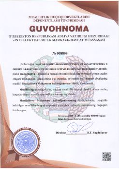 516 | №008807 | Monografiya –"METABOLIK SINDROMDA ARTERIYALARNING MORFOLOGIYASI" | Axmedova Sayyora Muxamadovna (50%), Xoshimov Bobir Luxmonovich (50%) | Axmedova Sayyora Muxamadovna, Xoshimov Bobir Luxmonovich | 04/11/2025 | ![]() |
