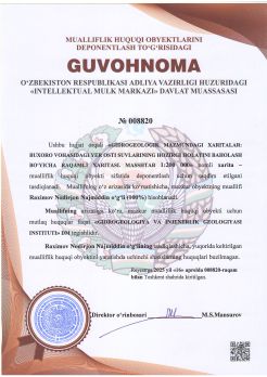 504 | №008819 | Xarita – "GIDROGEOLOGIK MAZMUNDAGI XARITALAR: BUXORO VOHASINING RAQAMLI GIDROGEOLOGIK XARITASI VA GIDROGEOLOGIK KESMALARI. MASSHTAB 1:200 000" | Raximov Nodirjon Najmiddin o‘g‘li (100%) | «GIDROGEOLOGIYA VA INJENERLIK GEOLOGIYASI INSTITUTI» DM | 04/16/2025 | ![]() |
