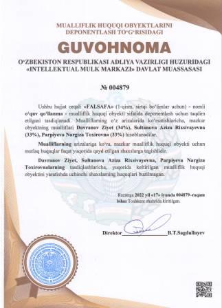 | 5220 | №004879 | O‘quv qo‘llanma -"FALSAFA" (1-qism, sirtqi bo‘limlar uchun) | Davranov Ziyet (34%), Sultanova Aziza Rixsivayevna (33%), Parpiyeva Nargiza Toxirovna (33%) | Davranov Ziyet, Sultanova Aziza Rixsivayevna, Parpiyeva Nargiza Toxirovna | 06/17/2022 | ![]() |