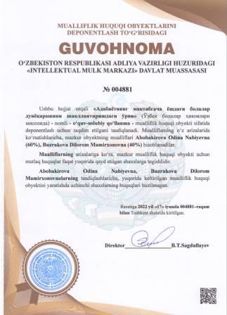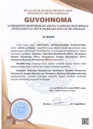 | 5206 | №004893 | Uslubiy qo‘llanma - "МЕТОДИКА ПРЕПОДАВАНИЯ ТЕХНОЛОГИИ" | Sanakulov Xamrakul Rizakulovich (40%), Maxkamova Muattar Uktamovna (20%), Niyazmetova Nargiza Baxromovna (20%), Nurmatova Shaxnoza Ibroximovna (20%) | Sanakulov Xamrakul Rizakulovich, Maxkamova Muattar Uktamovna, Niyazmetova Nargiza Baxromovna, Nurmatova Shaxnoza Ibroximovna | 06/21/2022 | ![]() |