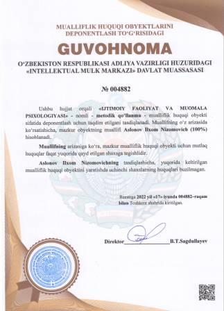 | 5217 | №004882 | Metodik qo‘llanma - "IJTIMOIY FAOLIYAT VA MUOMALA PSIXOLOGIYASI" | Aslonov Ilxom Nizomovich (100%) | Aslonov Ilxom Nizomovich | 06/17/2022 | ![]() |