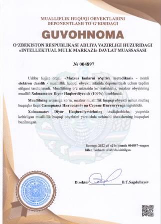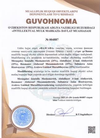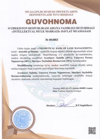 | 5216 | №004883 | Metodik qo‘llanma -"THEORETICAL BASIS OF LAND MANAGEMENT" | Avezbayev Sadulla (30%), Umarova Feruza Nigmatovna (40%), Sharipov Sayfuddin Raximovich (30%) | Avezbayev Sadulla, Umarova Feruza Nigmatovna, Sharipov Sayfuddin Raximovich | 06/17/2022 | ![]() |