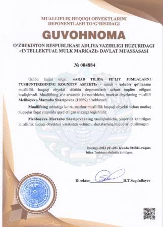 | 5215 | №004884 | Uslubiy qo‘llanma - "ARAB TILIDA FE’LIY JUMLALARNI TUSHUNTIRISHNING KOGNITIV ASPEKTI" | Meliboyeva Marxabo Sharipovna (100%) | Meliboyeva Marxabo Sharipovna | 06/20/2022 | ![]() |