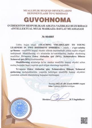 | 5214 | №004885 | O‘quv - uslubiy qo‘llanma -"TEACHING VOCABULARY TO YOUNG LEARNERS IN TWO DIFFERENT SPHERES" | To‘rayeva Zohra Abdualim qizi (50%), Xolmurodova Dilnoza Xolmurod qizi (50%) | To‘rayeva Zohra Abdualim qizi, Xolmurodova Dilnoza Xolmurod qizi | 06/20/2022 | ![]() |