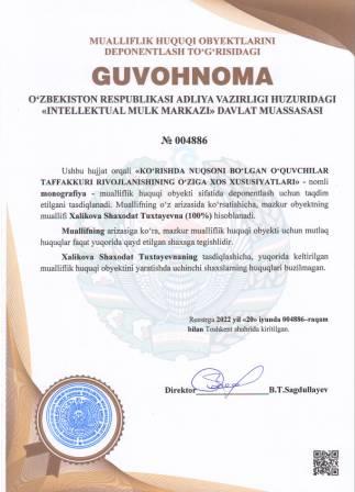 | 5213 | №004886 | Monografiya - "KO‘RISHDA NUQSONI BO‘LGAN O‘QUVCHILAR TAFFAKKURI RIVOJLANISHINING O‘ZIGA XOS XUSUSIYATLARI" | Xalikova Shaxodat Tuxtayevna (100%) | Xalikova Shaxodat Tuxtayevna | 06/20/2022 | ![]() |
