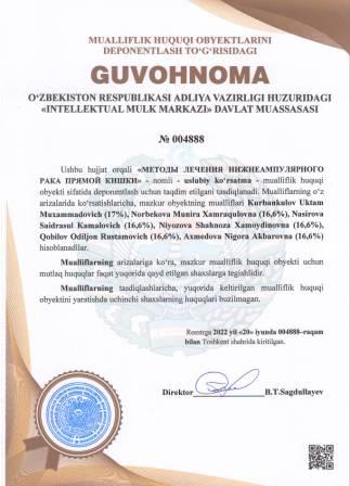 | 5211 | №004888 | Uslubiy ko‘rsatma - "МЕТОДЫ ЛЕЧЕНИЯ НИЖНЕАМПУЛЯРНОГО РАКА ПРЯМОЙ КИШКИ" | Kurbankulov Uktam Muxammadovich (17%), Norbekova Munira Xamraqulovna (16,6%), Nasirova Saidrasul Kamalovich (16,6%), Niyozova Shahnoza Xamoydinovna (16,6%), Qobilov Odiljon Rustamovich (16,6%), Axmedova Nigora Akbarovna (16,6%) | Kurbankulov Uktam Muxammadovich, Norbekova Munira Xamraqulovna, Nasirova Saidrasul Kamalovich, Niyozova Shahnoza Xamoydinovna, Qobilov Odiljon Rustamovich, Axmedova Nigora Akbarovna | 06/20/2022 | ![]() |