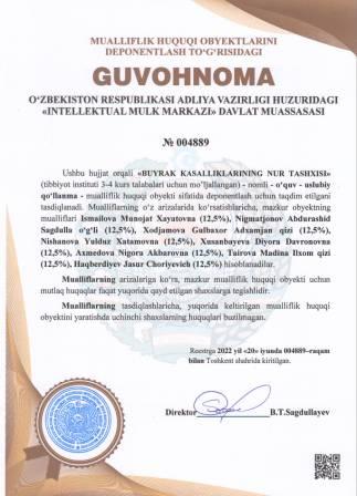 | 5210 | №004889 | O‘quv - uslubiy qo‘llanma -"BUYRAK KASALLIKLARINING NUR TASHХISI" (tibbiyot instituti 3-4 kurs talabalari uchun moʼljallangan) | Ismailova Munojat Xayatovna (12,5%), Nigmatjonov Abdurashid Sagdulla o‘g‘li (12,5%), Xodjamova Gulbaxor Adxamjan qizi (12,5%), Nishanova Yulduz Xatamovna (12,5%), Xusanbayeva Diyora Davronovna (12,5%), Axmedova Nigora Akbarovna (12,5%), Tairova Madina Ilxom qizi (12,5%), Haqberdiyev Jasur Choriyevich (12,5%) | Ismailova Munojat Xayatovna, Nigmatjonov Abdurashid Sagdulla o‘g‘li, Xodjamova Gulbaxor Adxamjan qizi, Nishanova Yulduz Xatamovna, Xusanbayeva Diyora Davronovna, Axmedova Nigora Akbarovna, Tairova Madina Ilxom qizi, Haqberdiyev Jasur Choriyevich | 06/20/2022 | ![]() |