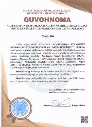 | 5209 | №004890 | O‘quv - uslubiy qo‘llanma -"ЛУЧЕВАЯ ДИАГНОСТИКА ПОРАЖЕНИЙ ОПОРНО-ДВИГАТЕЛЬНОЙ СИСТЕМЫ ВОСПАЛИТЕЛЬНОГО ГЕНЕЗА" | Xaydarova Guzal Bagiddinovna (14,2%), Ismailova Munojat Xayatovna (14,2%), Ilxamov Dilshod Farxadovich (14,2%), Nigmatjonov Abdurashid Sagdulla o‘g‘li (14,2%), Axmedova Nigora Akbarovna (14,2%), Nishanova Yulduz Xatamovna (14,2%), Haqberdiyev Jasur Choriyevich (14,2%) | Xaydarova Guzal Bagiddinovna, Ismailova Munojat Xayatovna, Ilxamov Dilshod Farxadovich, Nigmatjonov Abdurashid Sagdulla o‘g‘li, Axmedova Nigora Akbarovna, Nishanova Yulduz Xatamovna, Haqberdiyev Jasur Choriyevich | 06/20/2022 | ![]() |