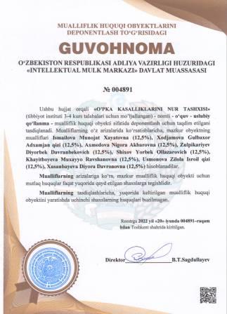 | 5208 | №004891 | O‘quv - uslubiy qo‘llanma -"O’PKA KASALLIKLARINI NUR TASHХISI" (tibbiyot instituti 3-4 kurs talabalari uchun moʼljallangan) | Ismailova Munojat Xayatovna (12,5%), Xodjamova Gulbaxor Adxamjan qizi (12,5%), Axmedova Nigora Akbarovna (12,5%), Zulpikariyev Diyorbek Davranbekovich (12,5%), Shixov Yorbek Ollazarovich (12,5%), Khayitboyeva Muxayyo Ravshanovna (12,5%), Usmonova Zilola Isroil qizi (12,5%), Xusanbayeva Diyora Davronovna (12,5%) | Ismailova Munojat Xayatovna, Xodjamova Gulbaxor Adxamjan qizi, Axmedova Nigora Akbarovna, Zulpikariyev Diyorbek Davranbekovich, Shixov Yorbek Ollazarovich, Khayitboyeva Muxayyo Ravshanovna, Usmonova Zilola Isroil qizi, Xusanbayeva Diyora Davronovnа | 06/20/2022 | ![]() |