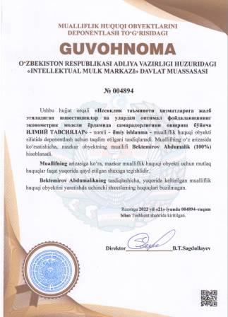 | 5205 | №004894 | Ilmiy ishlanma - "Иссиқлик таъминоти хизматларига жалб этиладиган инвестициялар ва улардан оптимал фойдаланишнинг эконометрик модели ёрдамида самарадорлигини ошириш бўйича ИЛМИЙ ТАВСИЯЛАР" | Bektemirov Abdumalik (100%) | Bektemirov Abdumalik | 06/21/2022 | ![]() |
