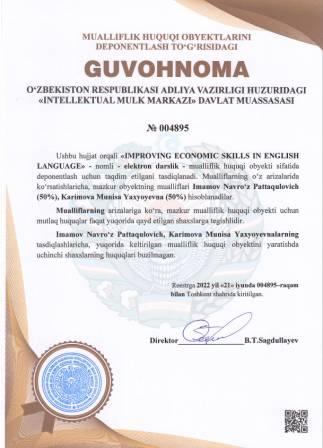 | 5204 | №004895 | Elektron darslik -"IMPROVING ECONOMIC SKILLS IN ENGLISH LANGUAGE" | Imamov Navro‘z Pattaqulovich (50%), Karimova Munisa Yaxyoyevna (50%) | Imamov Navro‘z Pattaqulovich, Karimova Munisa Yaxyoyevna | 06/21/2022 | ![]() |