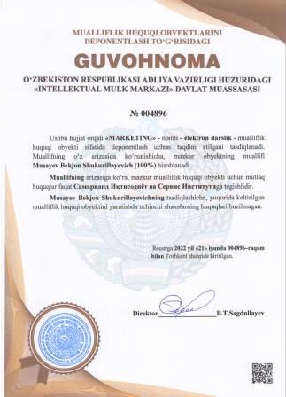 | 5203 | №004896 | Elektron darslik - "MARKETING" | Musayev Bekjon Shukurillayevich (100%) | Самарқанд Иқтисодиёт ва Сервис Институти | 06/21/2022 | ![]() |