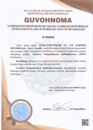 | 5259 | №004840 | Darslik - "TABIATSHUNOSLIK VA UNI O‘QITISH METODIKASI" | Voxidova Norposhshaxon Xabibullayevna (100%) | Voxidova Norposhshaxon Xabibullayevna | 06/10/2022 | ![]() |