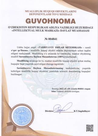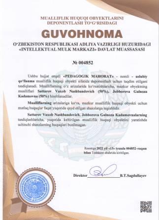 | 5247 | №004852 | Uslubiy qo‘llanma - "PEDAGOGIK MAHORAT" | Sattarov Vaxob Nashbandovich (50%), Jobborova Gulnoza Kadamovna (50%) | Sattarov Vaxob Nashbandovich, Jobborova Gulnoza Kadamovna | 06/13/2022 | ![]() |