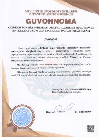 | 5257 | №004842 | Monografiya - "Bo‘lajak o‘qituvchilarda shaxslararo munosabat madaniyatini rivojlantirish" | Mirzayeva Faroxat Odiljonovna (100%) | Mirzayeva Faroxat Odiljonovna | 06/10/2022 | ![]() |