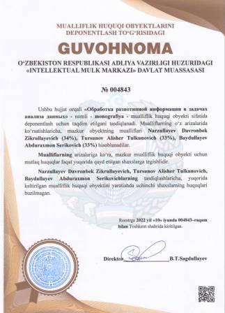 | 5256 | №004843 | Monografiya - "Обработка разнотипной информации в задачах анализа данных" | Narzullayev Davronbek Zikrullayevich (34%), Tursunov Alisher Tulkunovich (33%), Baydullayev Abduraxmon Serikovich (33%) | Narzullayev Davronbek Zikrullayevich, Tursunov Alisher Tulkunovich, Baydullayev Abduraxmon Serikovich | 06/10/2022 | ![]() |