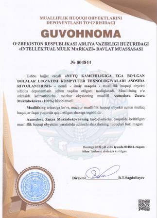 | 5255 | №004844 | Ilmiy maqola -"NUTQ KAMCHILIGIGA EGA BO‘LGAN BOLALAR LUG‘ATINI KOMPYUTER TEXNOLOGIYALARI ASOSIDA RIVOJLANTIRISH" | Axmedova Zuxra Murzabekovna (100%) | Axmedova Zuxra Murzabekovna | 06/10/2022 | ![]() |