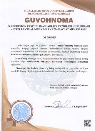 | 5254 | №004845 | Badiiy filmning ssenariy asari - "СУДЬЯ" | Xamroyev Sardorbek Islom o‘g‘li (100%) | "DILSHOH MEDIA" mas’uliyati cheklangan jamiyati | 06/10/2022 | ![]() |