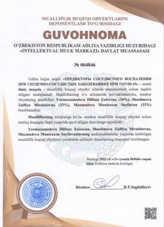 | 5253 | №004846 | Ilmiy maqola -"ПРЕДИКТОРЫ СОСУДИСТОГО ВОСПАЛЕНИЯ ПРИ СЕРДЕЧНО-СОСУДИСТЫХ ЗАБОЛЕВАНИЯХ ПРИ COVID-19" | Yarmuxamedova Dilfuza Zairovna (34%), Shaolimova Zulfiya Mirabitovna (33%), Maxmudova Muniraxon Sayfievna (33%) | Yarmuxamedova Dilfuza Zairovna, Shaolimova Zulfiya Mirabitovna, Maxmudova Muniraxon Sayfievna | 06/13/2022 | ![]() |