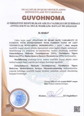 | 5252 | №004847 | Ilmiy maqola -"FEATURES OF HEART RATE VARIABILITY IN PATIENTS WITH HYPERTENSION WITH VARIOUS TYPES OF LEFT VENTRICULAR MYOCARDIAL REMODELING" | Zubaydullayeva Maksuda Turabdjanovna (34%), Nuritdinova Nigora Batirovna (33%), Shukurdjanova Surayyo Maxmudovna (33%) | Zubaydullayeva Maksuda Turabdjanovna, Nuritdinova Nigora Batirovna, Shukurdjanova Surayyo Maxmudovna | 06/13/2022 | ![]() |