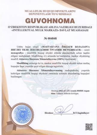 | 5251 | №004848 | Monografiya - "МАКТАБГАЧА ЁШДАГИ БОЛАЛАРГА ИНГЛИЗ ТИЛИ ЛЕКСИКАСИНИ ЎРГАТИШ МЕТОДИКАСИ" | Akbarova Shaxnoza Xikmatullayevna (100%) | Akbarova Shaxnoza Xikmatullayevna | 06/13/2022 | ![]() |