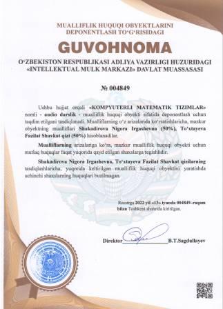 | 5250 | №004849 | Audio darslik - "KOMPYUTERLI MATEMATIK TIZIMLAR" | Shakadirova Nigora Irgashevna (50%), To‘xtayeva Fazilat Shavkat qizi (50%) | Shakadirova Nigora Irgashevna, To‘xtayeva Fazilat Shavkat qizi | 06/13/2022 | ![]() |