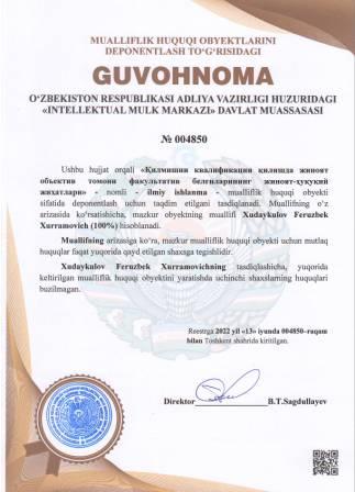 | 5249 | №004850 | Ilmiy ishlanma - "Қилмишни квалификация қилишда жиноят объектив томони факультатив белгиларининг жиноят-ҳуқуқий жиҳатлари" | Xudaykulov Feruzbek Xurramovich (100%) | Xudaykulov Feruzbek Xurramovich | 06/13/2022 | ![]() |