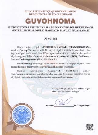 | 5248 | №004851 | O‘quv qo‘llanma -"FITOPREFARATLAR TEXNOLOGIYASI" | Ganiyev Abdumumin Kaxxarovich (50%), Pazilbekova Zamira Tanirbergenovna (50%) | Ganiyev Abdumumin Kaxxarovich, Pazilbekova Zamira Tanirbergenovna | 06/13/2022 | ![]() |