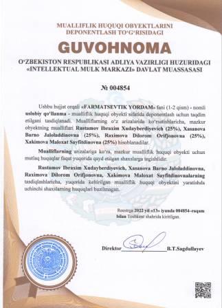 | 5245 | №004854 | Uslubiy qo‘llanma - "FARMATSEVTIK YORDAM" fani (1-2 qism) | Rustamov Ibraxim Xudayberdiyevich (25%), Xasanova Barno Jaloladdinovna (25%), Raximova Dilorom Orifjonovna (25%), Xakimova Maloxat Sayfitdinovna (25%) | Rustamov Ibraxim Xudayberdiyevich, Xasanova Barno Jaloladdinovna, Raximova Dilorom Orifjonovna, Xakimova Maloxat Sayfitdinovna | 06/13/2022 | ![]() |