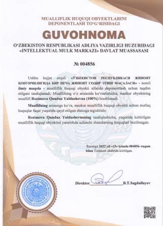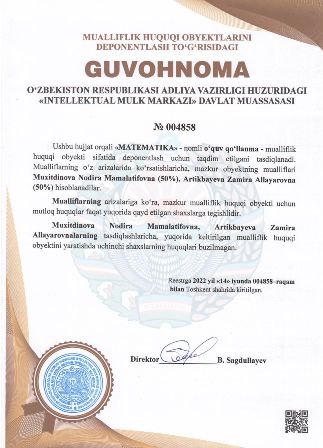 | 5241 | №004858 | O‘quv qo‘llanma - «MATEMATIKA» | Muxitdinova Nodira Mamalatifovna (50%), Artikbayeva Zamira Allayarovna (50%) | Muxitdinova Nodira Mamalatifovna, Artikbayeva Zamira Allayarovna | 06/14/2022 | ![]() |