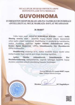| 5242 | №004857 | Badiiy filmning ssenariy asari - "БЛАГОСЛОВЕННАЯ ЗЕМЛЯ" | Agishev Odelsha Aleksandrovich (34%), Isxakov Djasur Ilxamovich (33%), Ishmukhamedov Eler Muxitdinovich (33%) | Agishev Odelsha Aleksandrovich, Isxakov Djasur Ilxamovich, Ishmukhamedov Eler Muxitdinovich | 06/13/2022 | ![]() |