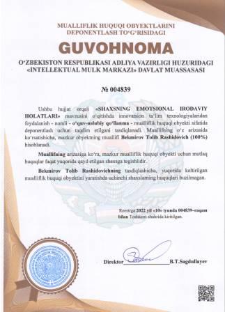 | 5260 | №004839 | O‘quv - uslubiy qo‘llanma -"SHAXSNING EMOTSIONAL IRODAVIY HOLATLARI" mavzusini o‘qitishda innovatsion ta‘lim texnologiyalaridan foydalanish | Bekmirov Tolib Rashidovich (100%) | Bekmirov Tolib Rashidovich | 06/10/2022 | ![]() |