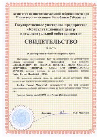 | 5320 | №004778 | Монография - "LEGALIZATION OF REVENUE RECEIVED FROM CRIMINAL ACTIVITIES" (CRIMINAL – LEGAL AND CRIMINOLOGICAL ASPECTS) | Fazilov Farxod Maratovich (100%) | Fazilov Farxod Maratovich | 05/17/2022 | ![]() |
